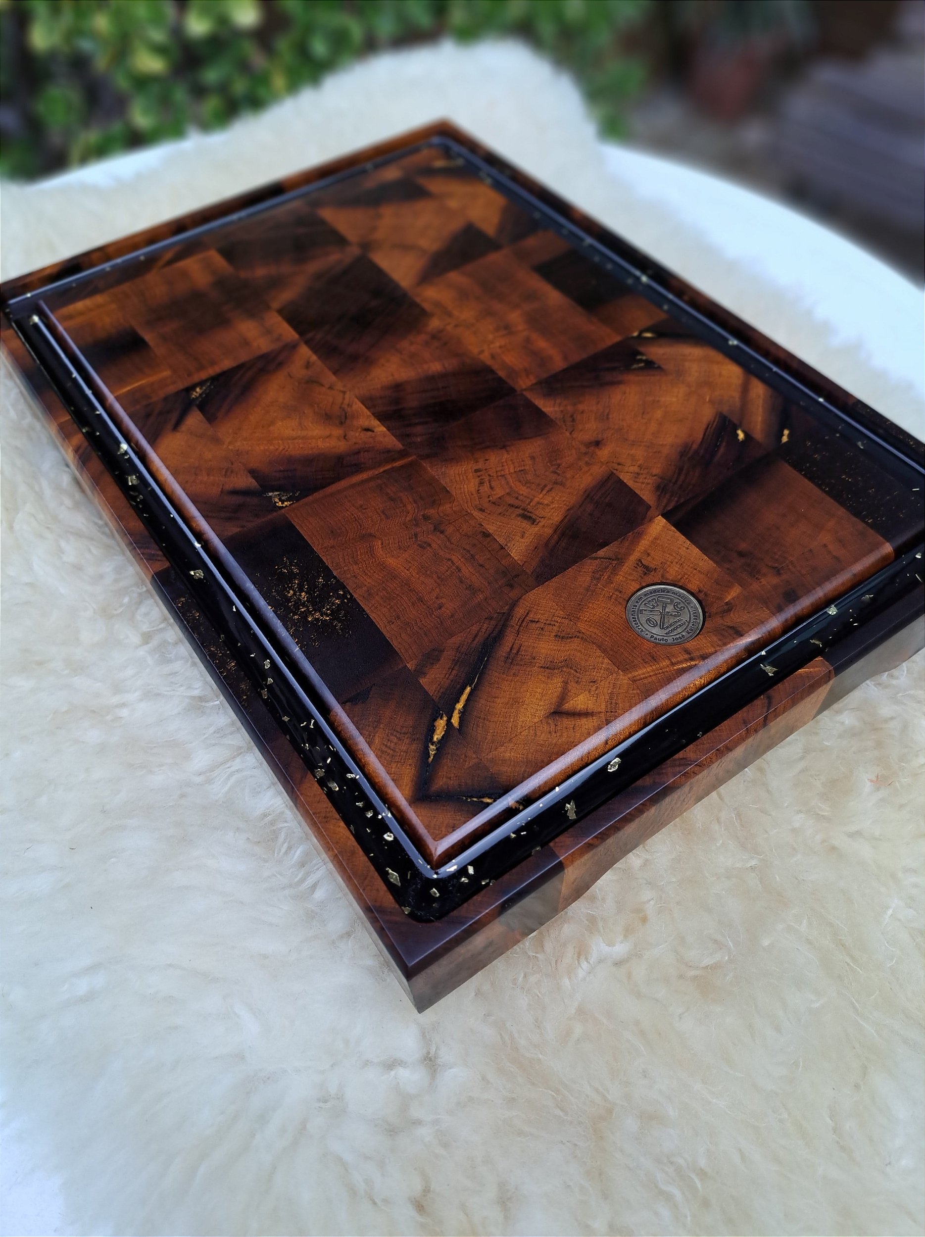 Confeccionada com as fibras das madeiras para cima (end grain).