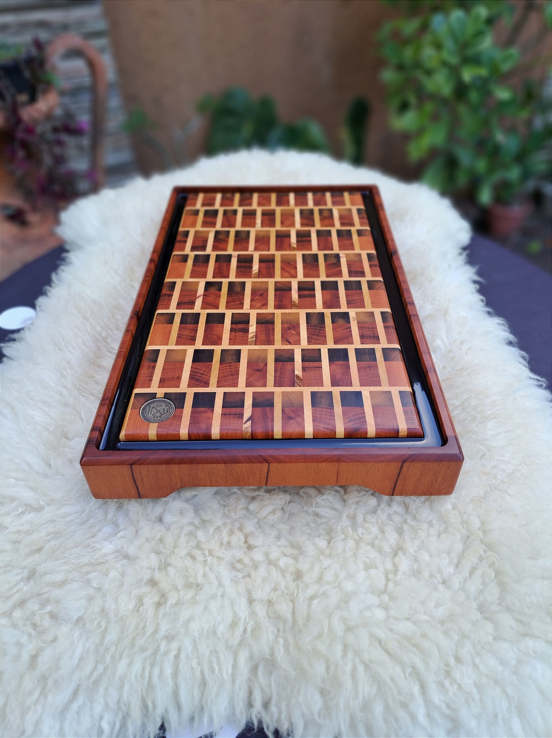 Confeccionada com as fibras das madeiras para cima (end grain).