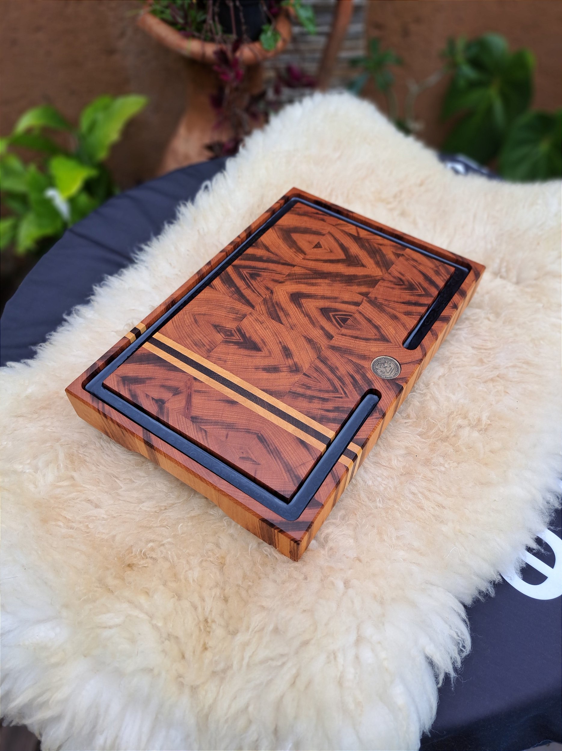 Confeccionada com as fibras das madeiras para cima (end grain).