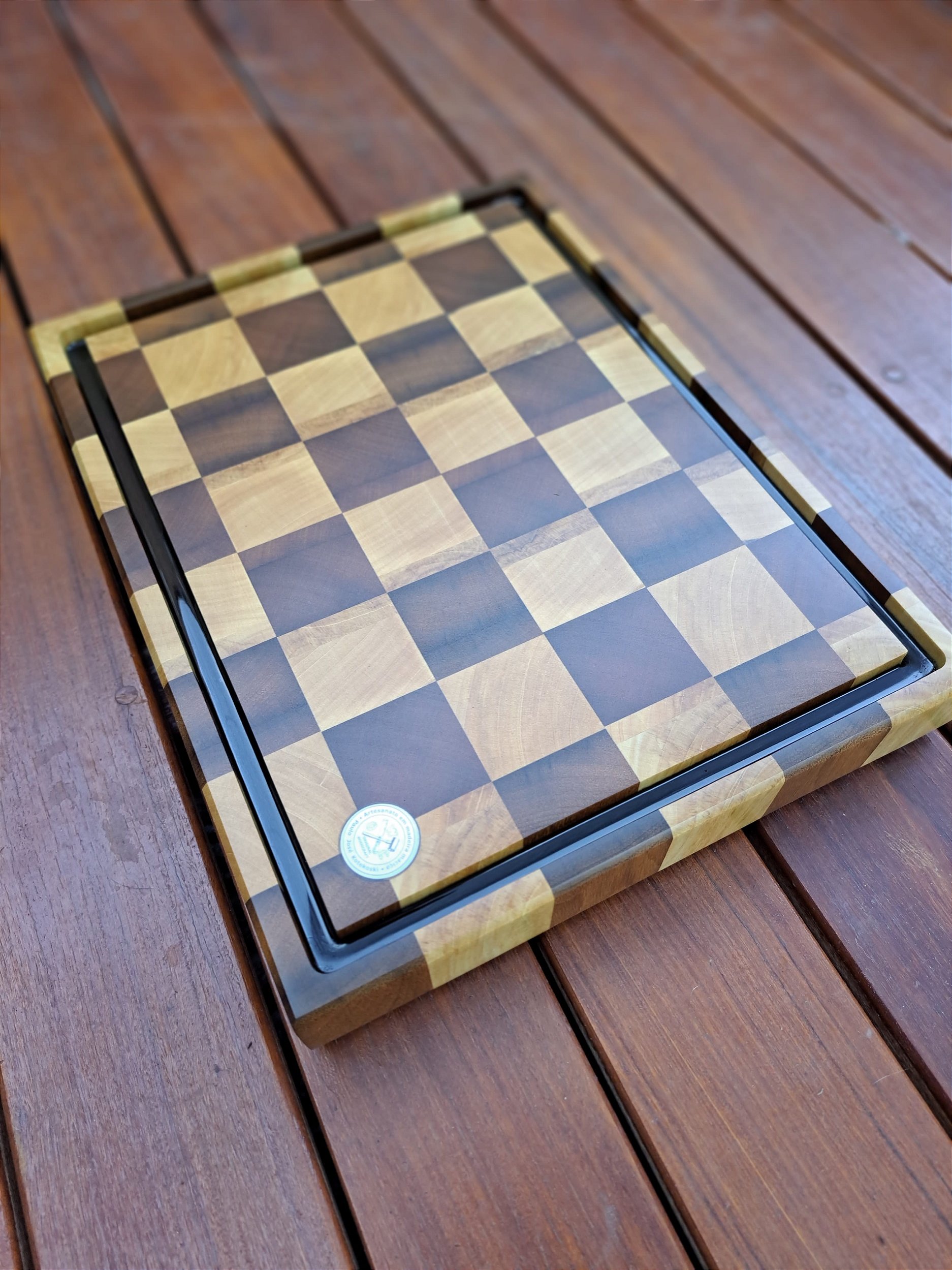 Confeccionada com as fibras das madeiras para cima (end grain).