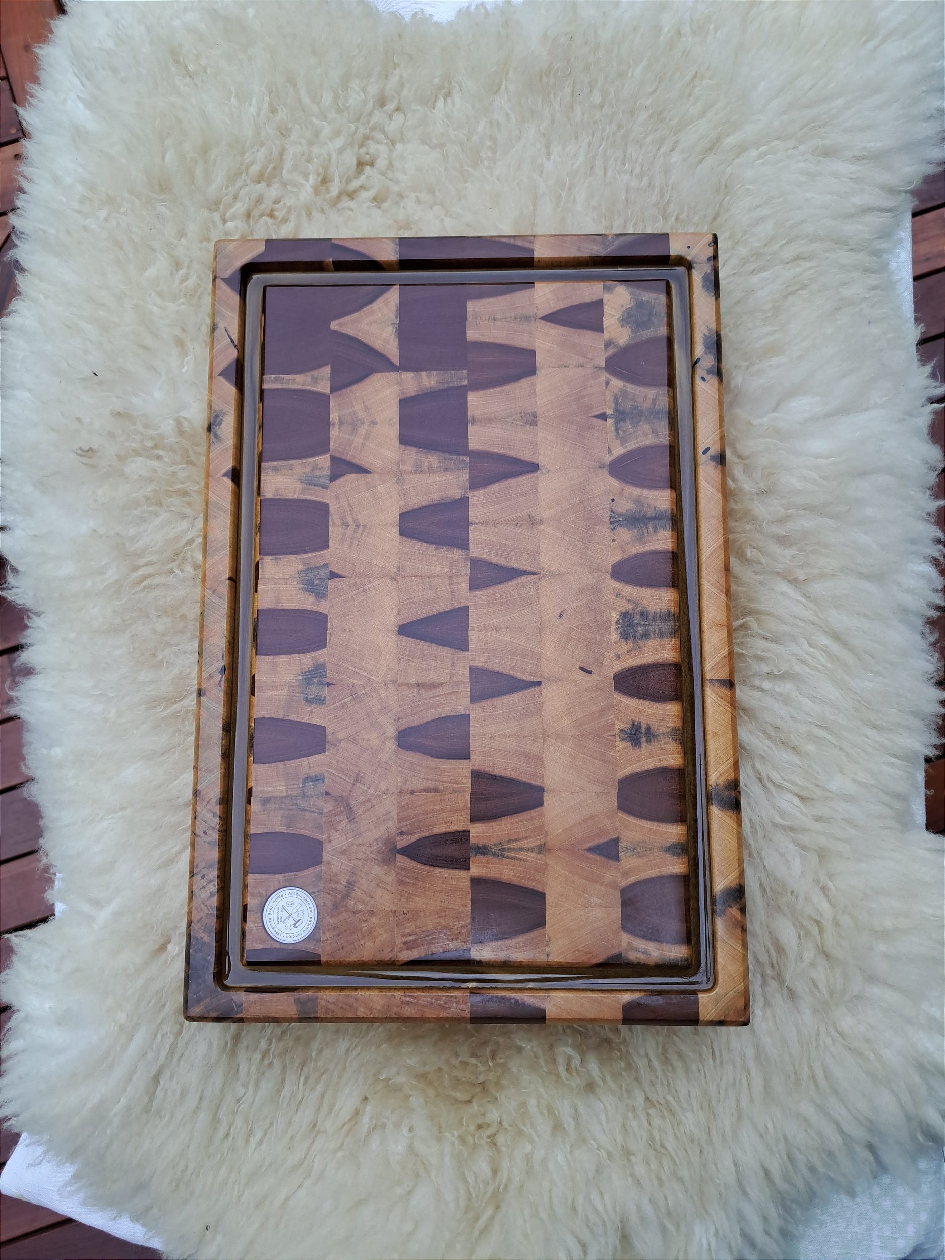 Confeccionada com as fibras das madeiras para cima (end grain).
